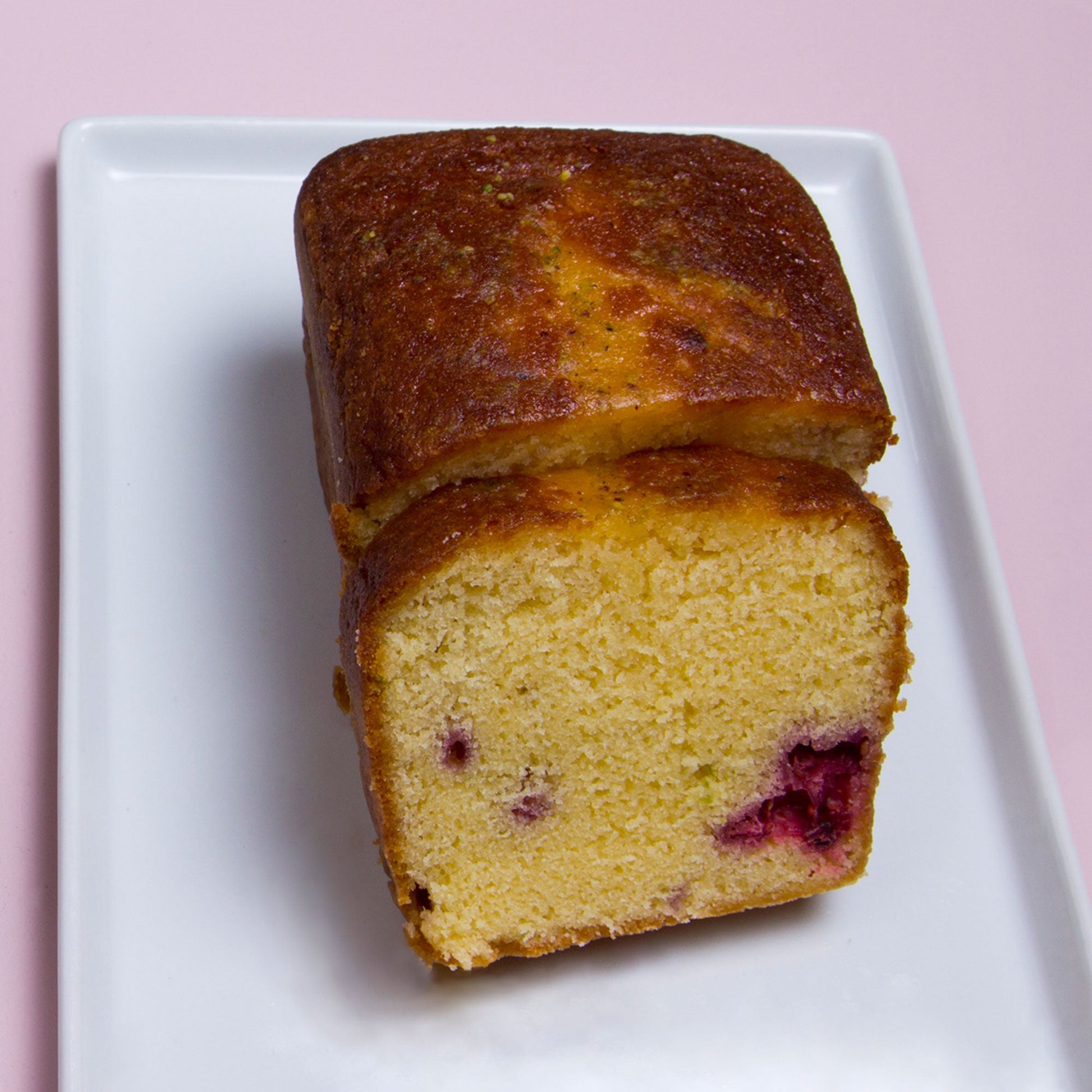 850 gramos de Bizcocho suave de limón mezclados  con frambuesas enteras.